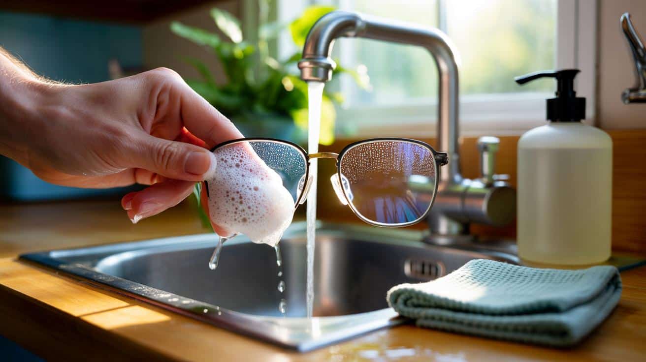 - Brille mit lauwarmem Wasser abspülen. Heißes Wasser meiden.